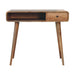 - Curved Oak-ish Writing Desk - Introducing our stylish Writing Desk, crafted from solid mango wood. It's sustainably sourced and comes in a beautiful oak-ish finish. With one open slot and one drawer, it helps keep your space tidy. One shiny brass knob and and four Nordic-style legs add a touch of elegance. Perfect for work or study, this desk is a functional and attractive addition to your home or office.