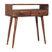 - Artisan Furniture Solid Wood Curved Console Table, 2 drawer - This simple, elegant console table has beautifully curved edges to fit perfectly in any living space, this 100% solid mango wood unit has been built with sustainably sourced timbers and has two drawers and 1 open slot to help you keep your home organized and storage for any little household objects. It has shiny knobs and has a fine finish with 4 Nordic style legs.