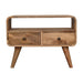 - Mini Curved Oak-ish Media Unit - Our mini solid timber media unit is expertly constructed from 100% solid mango wood in a lovely oak-ish finish. Some features include 2 drawers that come with a shiny knob, a large open slot to place any books, photo frames, ornaments, and 4 Nordic-style legs. This petite product is part of Recession Collection.