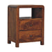 - Features: solid wood, mango wood, chestnut, shiny brass knobs, bedside, bedroom, 2 drawers, open slot