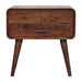 • Avora 3-Drawer Chestnut Nightstand - A perfect blend of mid-century design and everyday functionality, this nightstand is handcrafted from 100% Solid Mango Wood in a rich chestnut finish. Featuring a gracefully curved structure, it includes three compact drawers adorned with brass knobs and a sleek brass handle, offering convenient storage for your essentials. The tapered Nordic-style legs add a touch of elegance, making it a versatile addition to any bedroom or living space. Durable, sustainable, and stylish, this timeless piece effortlessly enhances your home with its refined craftsmanship and practical design.