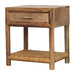 - Regency Woven Oak-ish Nightstand with Drawer - A stunning blend of artisanal craftsmanship and contemporary design, this bedside table is handcrafted from 100% Solid Mango Wood in a warm Oak-ish finish. Featuring a brass handle on the spacious drawer for a refined touch, it provides convenient storage while maintaining a sleek aesthetic. The leather handwoven braided bottom shelf adds texture and functionality, offering extra space for books, decor, or essentials. Supported by sturdy wooden legs, this piece exudes durability and elegance, making it a perfect addition to any bedroom or living space. Designed for those who appreciate sustainable, handcrafted furniture, it effortlessly combines style and practicality.