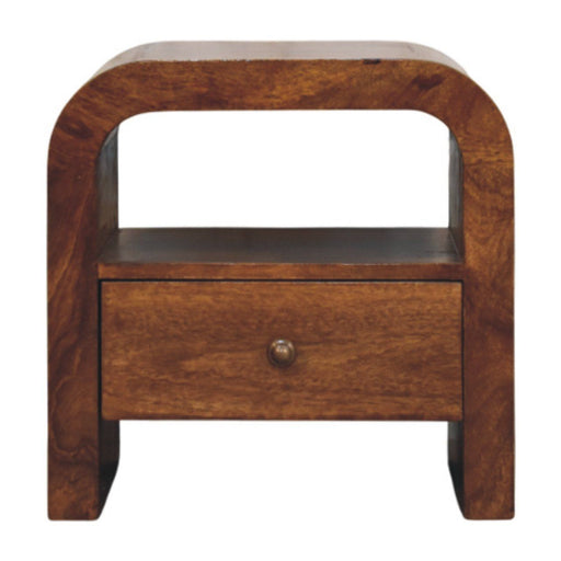 Split Chestnut Nightsand - Introducing our Split Chestnut nightsand, a charming addition to your bedroom. With a curved shape concept, and conveni...