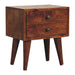 - Mini Chestnut Modern Nightsand - Endlessly versatile, this mini nightsand table makes a perfect stand for nibbles, drinks, or a lamp and will prove handy all over your home. It is made from 100% solid mango wood in a chestnut finish and features 2 drawers. Other features include shiny knobs on the drawers and 4 Nordic-style legs.