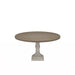 - Crafted for those who appreciate the finer details in their dining space, the Tannen Dining Table presents a harmonious blend of sophistication and rustic charm. This elegantly designed table features a generous 59" round tabletop that gracefully sits atop a sturdy white pedestal base, ensuring both stability and style. The natural grain variation across the table's surface adds an organic touch, beautifully contrasted by a distressed finish that brings an air of lived-in luxury to any room. This dining table promises durability and a timeless appeal, making it a perfect centerpiece for gatherings, meals, and memorable conversations.