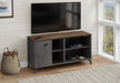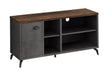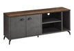 Industrial Design: This TV stand features an industrial style with a unique faux concrete finish complemented by a reclaimed wood-look. It's accentuated with sleek, angled legs and a stylish metal cup pull cabinet door handle.