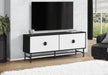 • Ample Storage: The TV console provides extensive storage space for media accessories, with two cabinets each containing a fixed shelf. It also includes two wire management holes to keep cords organized and hidden.