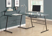 Stylish Design: This contemporary L-shaped computer desk features a sleek, laminate finish with metal accents, enhanced by a rounded corner panel, making it an attractive addition to any modern home office.