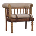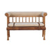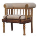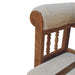 - Strapped Hallway Bench - Add some luxury style to your home living area with this fabulous carved hallway bench. It is constructed from 100% solid mango wood in an oak-ish finish and upholstered in 100% cream boucle which is presented on the seat and backrest. Other features include buffalo leather buckle straps which can be secured or undone and hand turned front legs.