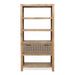 Ample Storage: Features a framed drawer front with jute weave and four spacious shelves for books, photos, and knick-knacks.