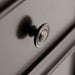 - Transitional style includes tapered legs, molded crown edged table top, and antique pewter round decorative knobs