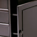 - Features four drawers with metal drawer glides and one door which opens to a large storage space with 2 adjustable shelves