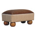 - Tan Leather Boucle Ball Footstool - With a sophisticated buffalo hide leather seat, this footstool boosts a contrast between 3 different fabrics and finishes. Derived from the French word for 'curled' or 'ringed' yarn or fabric the base is upholstered from 100% cotton and natural yarn, and the footstool stands on 4 ball feet which are constructed from 100% solid mango wood built for sturdiness.