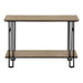 Design & Finish: This 2-tier console table features a stylish wood-look finish on both the tabletop and bottom shelf, complemented by a contrasting metal base with open, U-shaped legs and decorative H-frame sides.