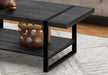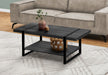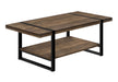 Industrial-Farmhouse Style: Rectangular coffee table featuring a rustic reclaimed wood-look finish with a fixed lower shelf for extra storage.