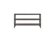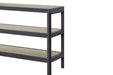 Design Features: The table incorporates metal insets on all three shelves, adding an industrial touch to its softer modern design elements.