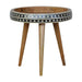-  Small Patterned Nordic Style End Table - This solid wood end table has made from 100% mango wood in a fine finish. The no-fuss finish reveals the beautiful grain of the mango wood which this piece of furniture is made of. This tripod table stands on Nordic style legs and features a and white bone inlay pattern on the edges. The bone is sourced responsibly from deceased animals such as camels, goats, and buffaloes.